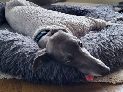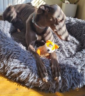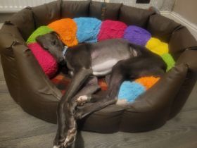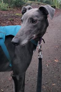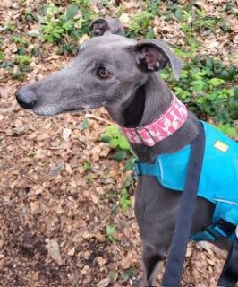 Glitz ( born February 2022) is a beautiful blue female greyhound who would like to live with another greyhound as her black brother, Glint, has been her guardian angel to date.