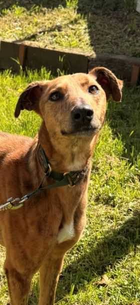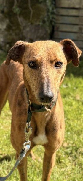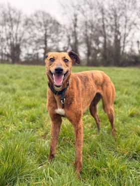 Yips (born Feb 2025)) is a smallish female lurcher who is a happy, sweet natured girl with a very soft, gentle side. She loves to give and receive affection. She is sociable and loves to run and play with other dogs. She walks well on the lead and could live with respectful children