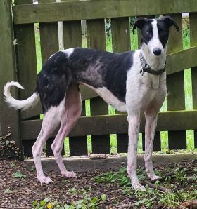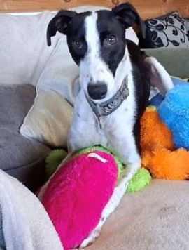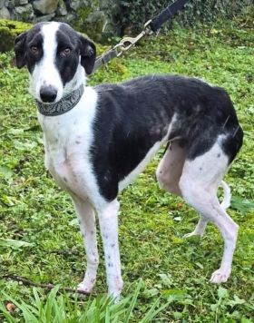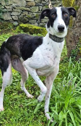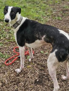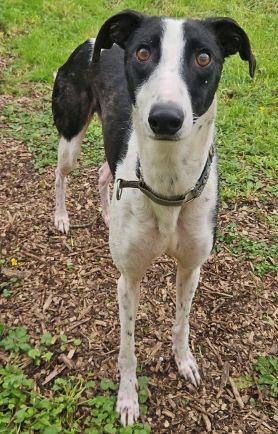 Funghi (born April 2025) is a smallish, female lurcher recovering from her days as a mange- covered stray and blossoming into a sweet natured girl who has not let her poor start dampen her enthusiasm for life. She adores greeting new people and making new friends. Her play is on the “rough and tumble” end of the spectrum so any dog she lives with should be happy with that.