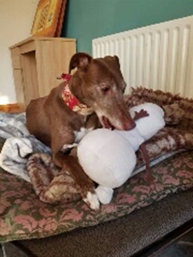 She is a rare dun coloured greyhound and simply loves people and toys. She does not like small dogs and can get giddy in play therefore we are looking for a dog savvy home with no small dogs, a garden and no very young children. She is a confident girl who is nosey and loves being involved in whatever is going on and travels well. She could be an only dog in a home where she gets plenty of attention and a great wardrobe as she loves wearing coats!