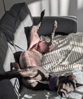 Billy ( born June 2022) is a male greyhound who is tall, handsome, dark and keen so who would like to meet similar to be his owner! He is a confident, outgoing boy and very friendly. He is very good in the house and is doing well in foster care. He cannot live with cats or small furries.