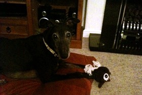 Ranger enjoys a little play with his soft toys now and again in his foster home but like most greyhounds, sleeping is his favourite pastime.
