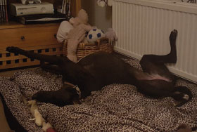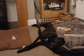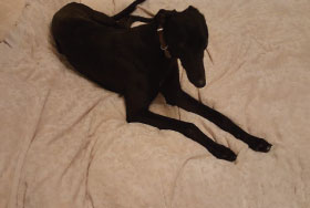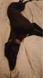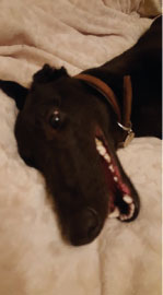 Onion (born June 2014) is a small black female greyhound. She is inquisitive and friendly and loves to play! Being a youngster, she will need an owner who is around much of the time and would be a lovely family pet with older children.