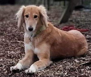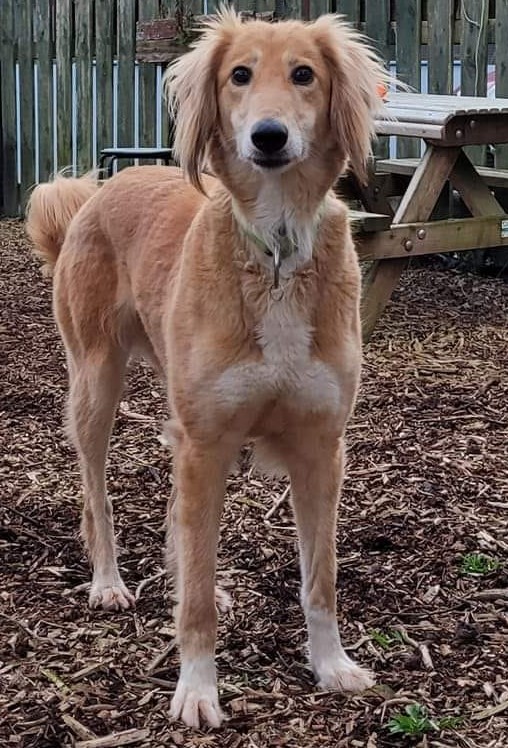 Myth (born 2021) is a female saluki who almost before her adult life began, found herself in a dog pound and was understandably shy, never having experienced a friendly human.  After spending months in the pound, in the care of her rescuers she has blossomed into a playful girl who still has her shy side but will come over for a cuddle when suitably coaxed. She would need a quiet home with a confident, playful, kind dog to ease her into the world of being a pet. She is quite puppyish now that she has left her past behind so would need someone at home for most of the day.  She travels well and walks well on the lead. She needs a secure garden and a home without young children due to her shyness.
