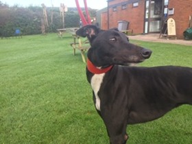 Saab ( born May 2017) is a friendly female greyhound who loves her walks and playtime. She is in foster with a terrier and is good with other dogs.
