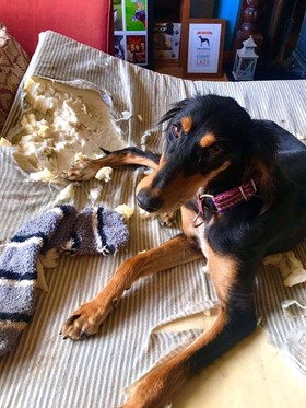 Being in a home for the first time, having been picked up as a stray, has been entertaining for McLaren but not so much for his foster family.  If it’s not nailed to the floor, then McLaren considers it to be “his” and in true saluki style, never looks guilty if caught.  Shoes, socks, clothes, food, toilet rolls ,books, rugs, post and parcels have all been found in the garden ,some intact,…some not ..but you have got to love his enthusiasm for his new life and all the wonders it holds.