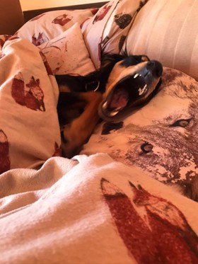 At night, McLaren goes to bed with his foster mum and is happy to remain stretched out across the pillows until the following morning ,when it’s time to get up.