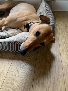 Himba (born June 2016) is a lively female greyhound who loves her walks and her toys. She sleeps well at night and could be an only dog though is good with other dogs.